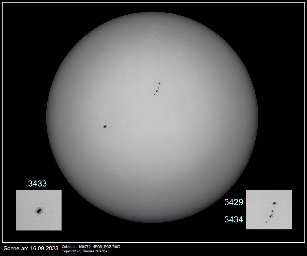 Man sieht auf dem Sonnenbild einige Sonnenflecke. Zum einen den Sonnenfleck 3433, der etwas links auf der Sonne ist und dann sieht man noch die Fleckengruppe die aus den Flecken 344 und 3429 besteht. Oben im Bild sieht man noch einen weiteren kleinen Sonnenfleck. Das ist der Sonnenfleck 3425.