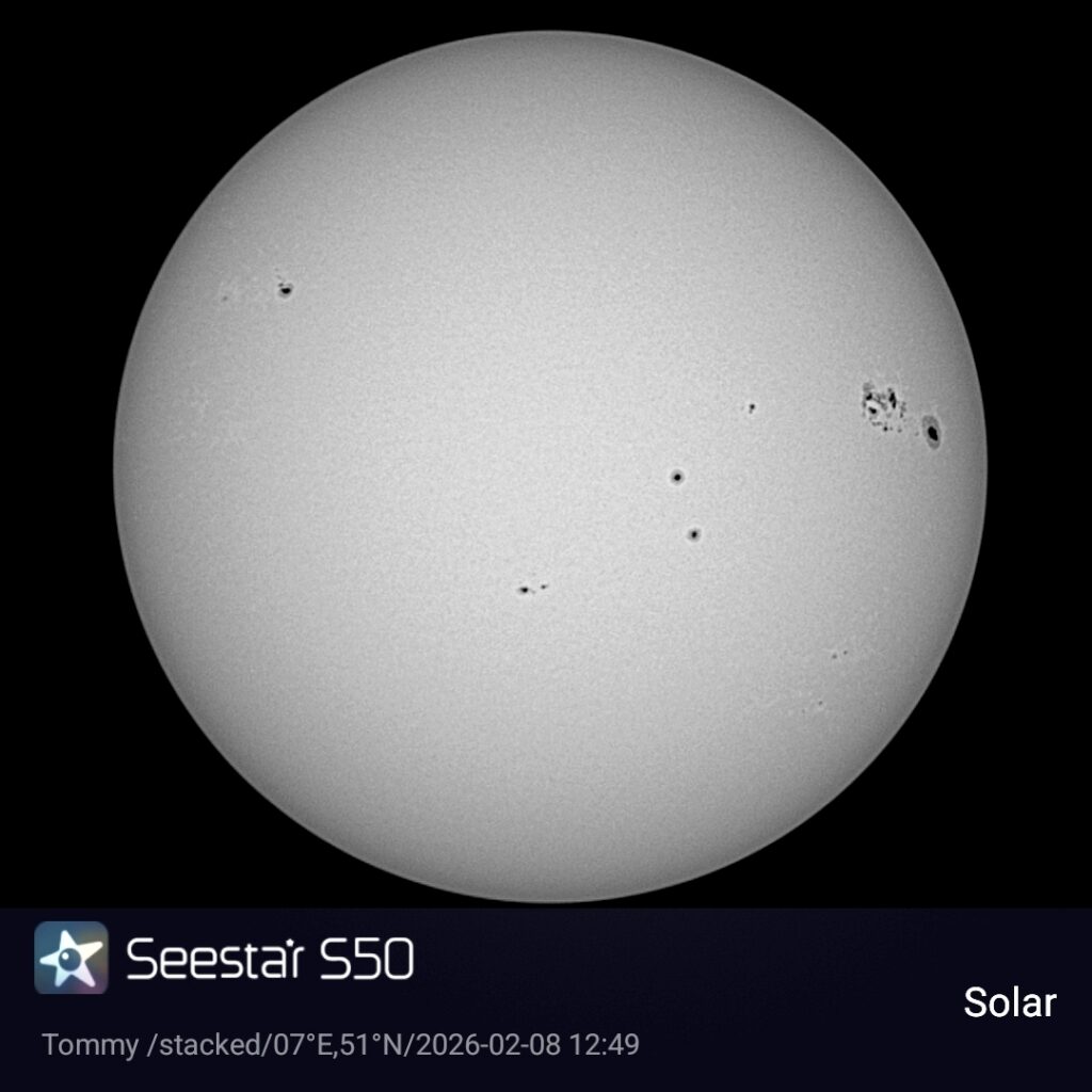 Sonne vom 08.02.2026 SonnenbeobachtungFebruar 8, 2026Februar 8, 2026 admin Dies ist das Sonnenbild von Heute. Ich konnte es mit meinem Seestar S50 aufnehmen.